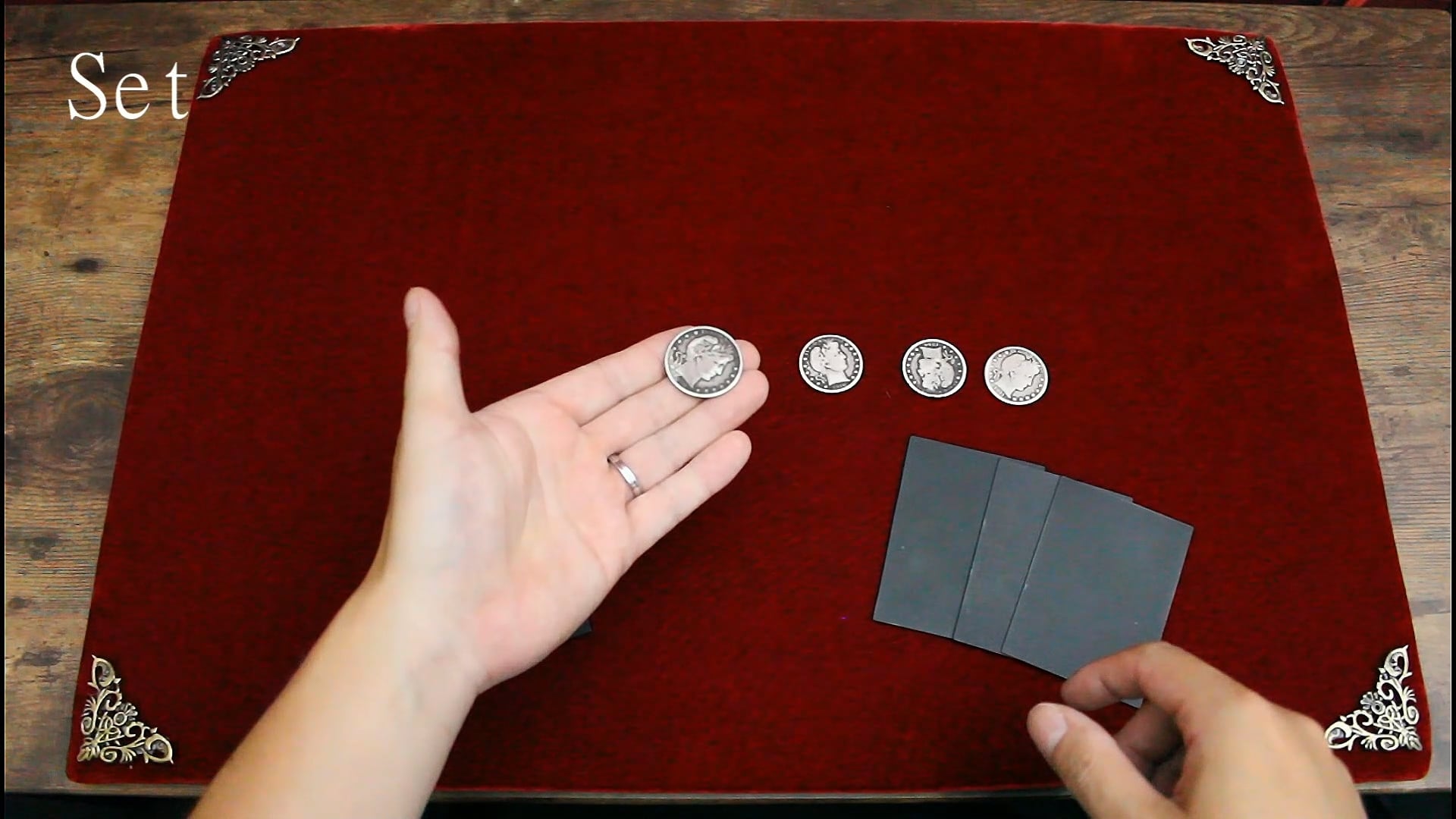 4枚のコインの上に黒いカードが1枚ずつのっている状態でコインが段々と一か所に集まっていきますが、最後は一瞬にして最初の状態に戻ります。