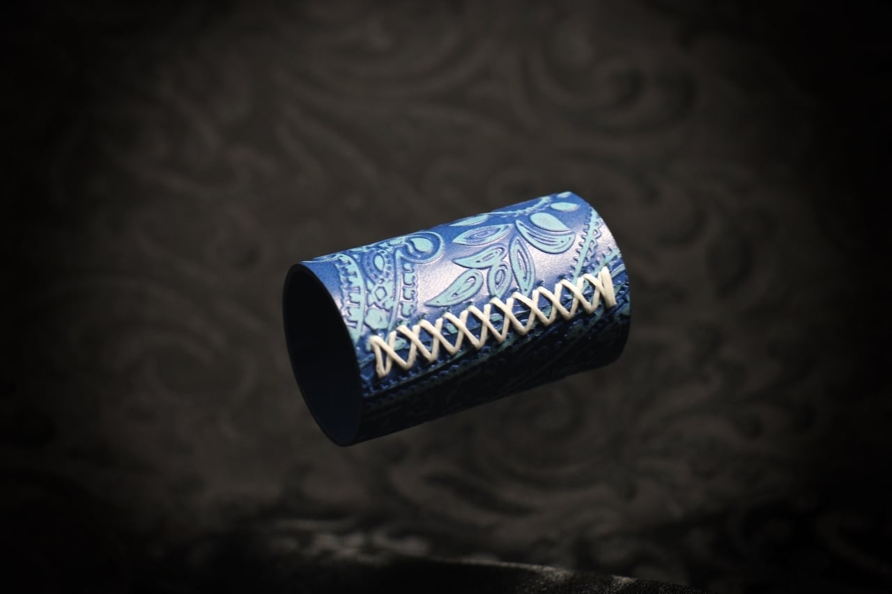 こちらのシリンダーはインディゴ染めの瀬戸内レザーを使用したマジックマーケット2022(秋)開催記念限定モデルです。ペイズリー柄の型押しと銀スリ加工が施されているので凹凸のコントラストが素晴らしいデザイン性の高い仕上がりになっています。